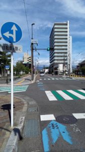 右手の大きなマンションの先に『守山駅前郵便局』が見えたら手前の細道を右折してください。
